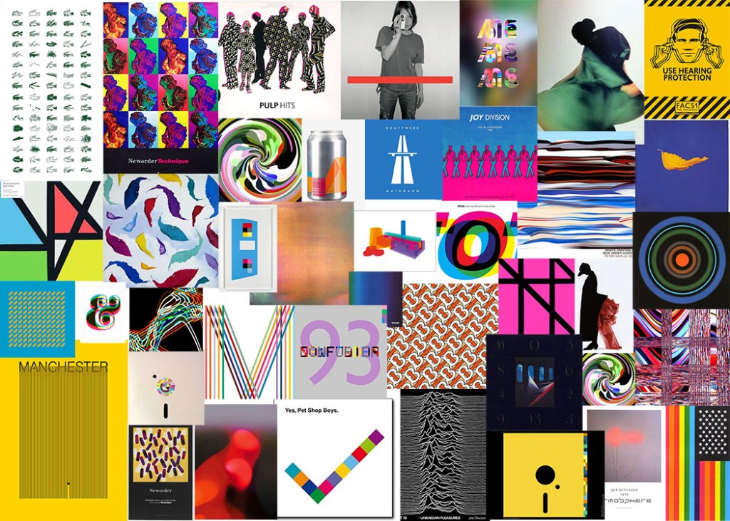 I have researched work of Peter Saville – world famous graphic designer. I got inspired by creative use of geometrical figures, along with clever usage of light in the images. I decided to position bright yellow posters on the edges of the collage, to keep viewer’s attention. I like the use of strong, vibrant colours and surreal feel of the images.
