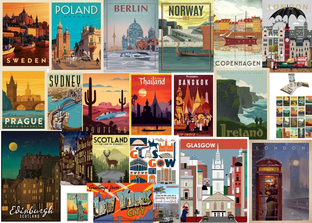 I have created the collage of the travel post card designs. Most of them is created in vintage style, as this is my favourite. In my collage I have included majority of European capital cities post cards, emphasising on colours and fonts. Post cards chosen are very vibrant, containing strong warm colours. They show biggest city attractions or breath-taking skyline views. I have tried to mix most colourful post cards next to more toned-down, to create nice contrast and avoid overload of elements.